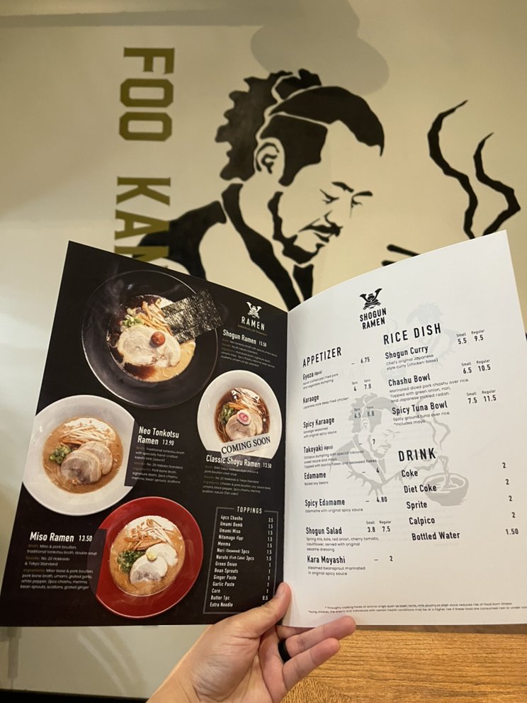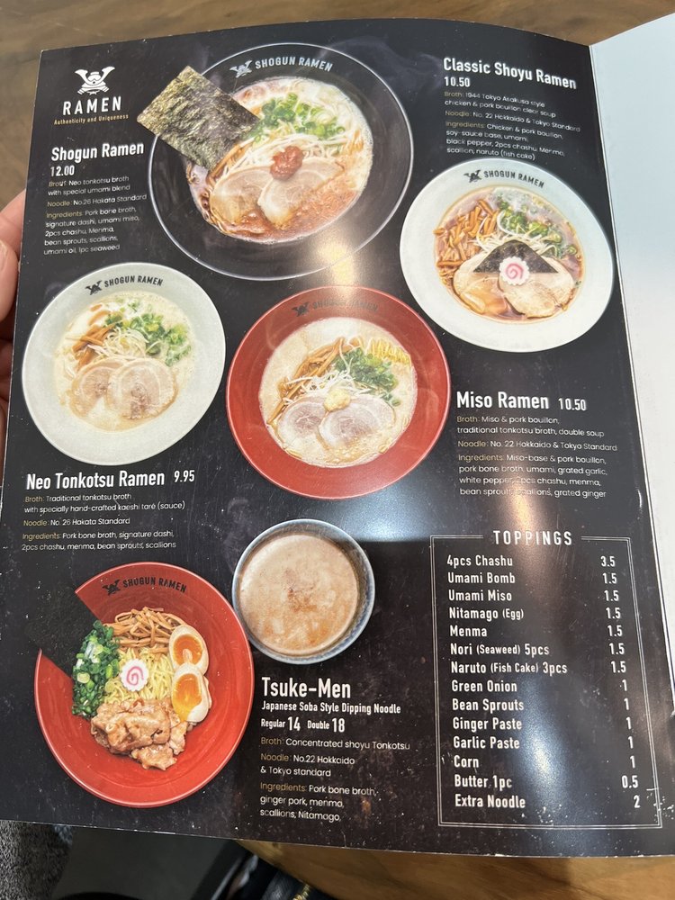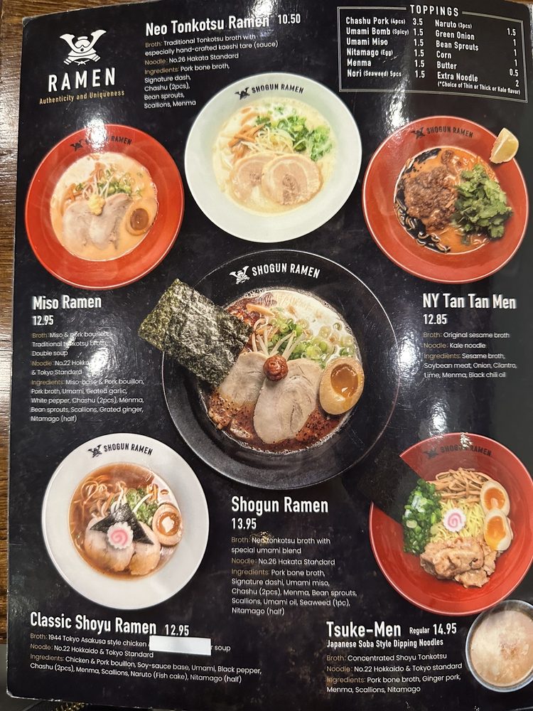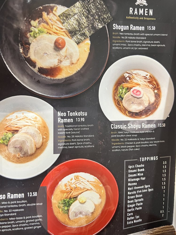 Broth: neo tonkotsu broth with special umami blend. Noodle: No. 26 hakata standard. Ingredients: pork bone broth, signature dashi, umami miso, 2 pieces chashu,Half soft boiled egg, menma, bean sprouts, scallions, umami oil, 1 piece seaweed.